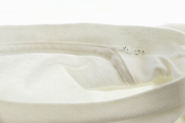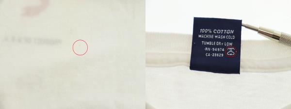 状態 写真のように、プリント割れ、首周りに黄ばみ・ヨレ、前身頃印部分に変色、後身頃印部分に小さなシミがございますがまだまだ着用いただけるお品物かと思われます。