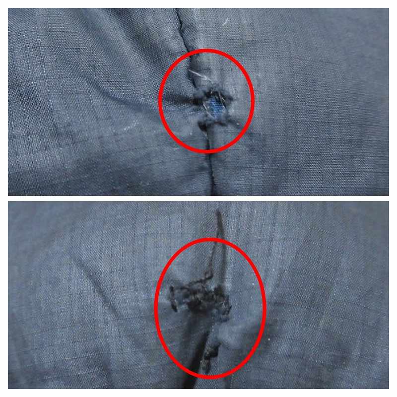 ・右袖に5mm程度の破れ、両袖、ポケット口に個人補修跡あり、正面裾に1mm、5mm程度の破れ