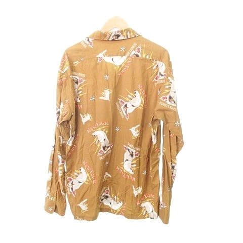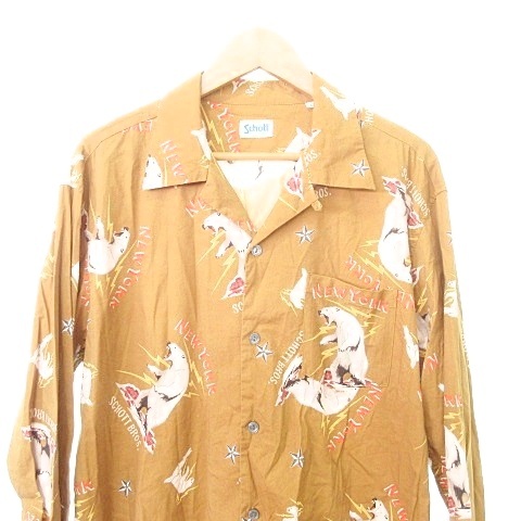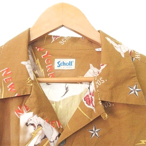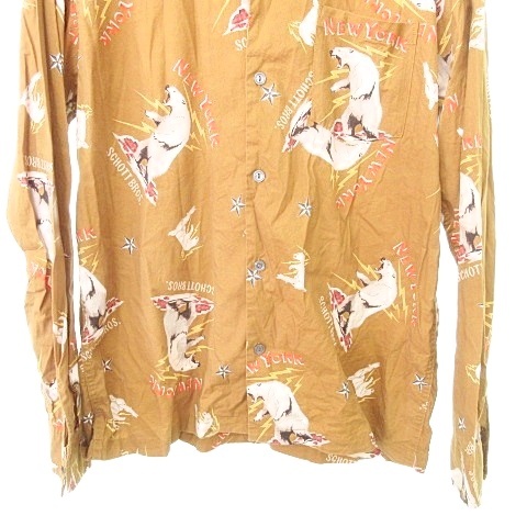 • ショット SCHOTT 美品 アラスカ柄 スキッパー シャツ ブラウス 長袖 総柄 Lサイズ 茶 ブラウン系 メンズ