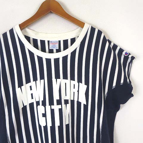 チャンピオン CHAMPION リバースウィーブ Tシャツ カットソー CW-F302 ストライプ プリント ロゴ 刺繍 ラグランスリーブ 半袖 L 紺 ネイビー オフ白 レディース