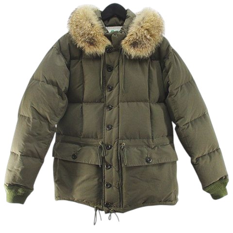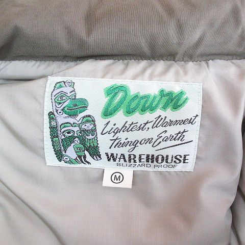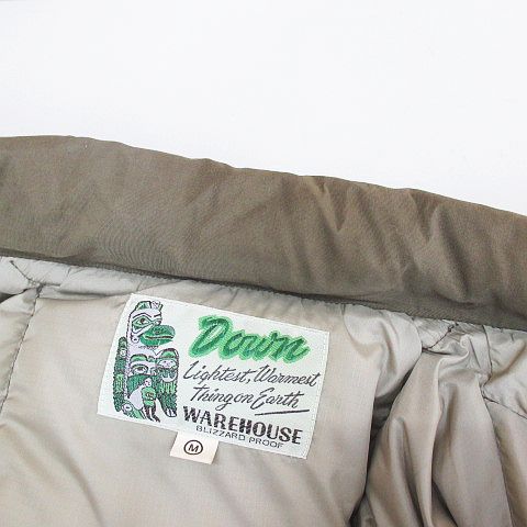 ウエアハウス WAREHOUSE ブリザードプルーフ BLIZZARD PROOF ダウン ジャケット M 緑系 カーキ 無地 フード ファー ジップアップ ボタン 裏地 メンズ
