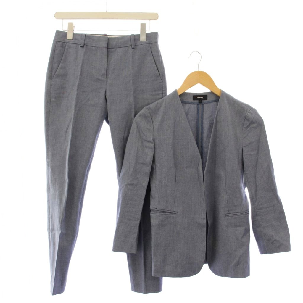 セオリー Theory セットアップ ノーカラージャケット アウター 前開きトッパー スラックスパンツ ジップフライ ワンカラー 0 青 ブルー /BB レディース