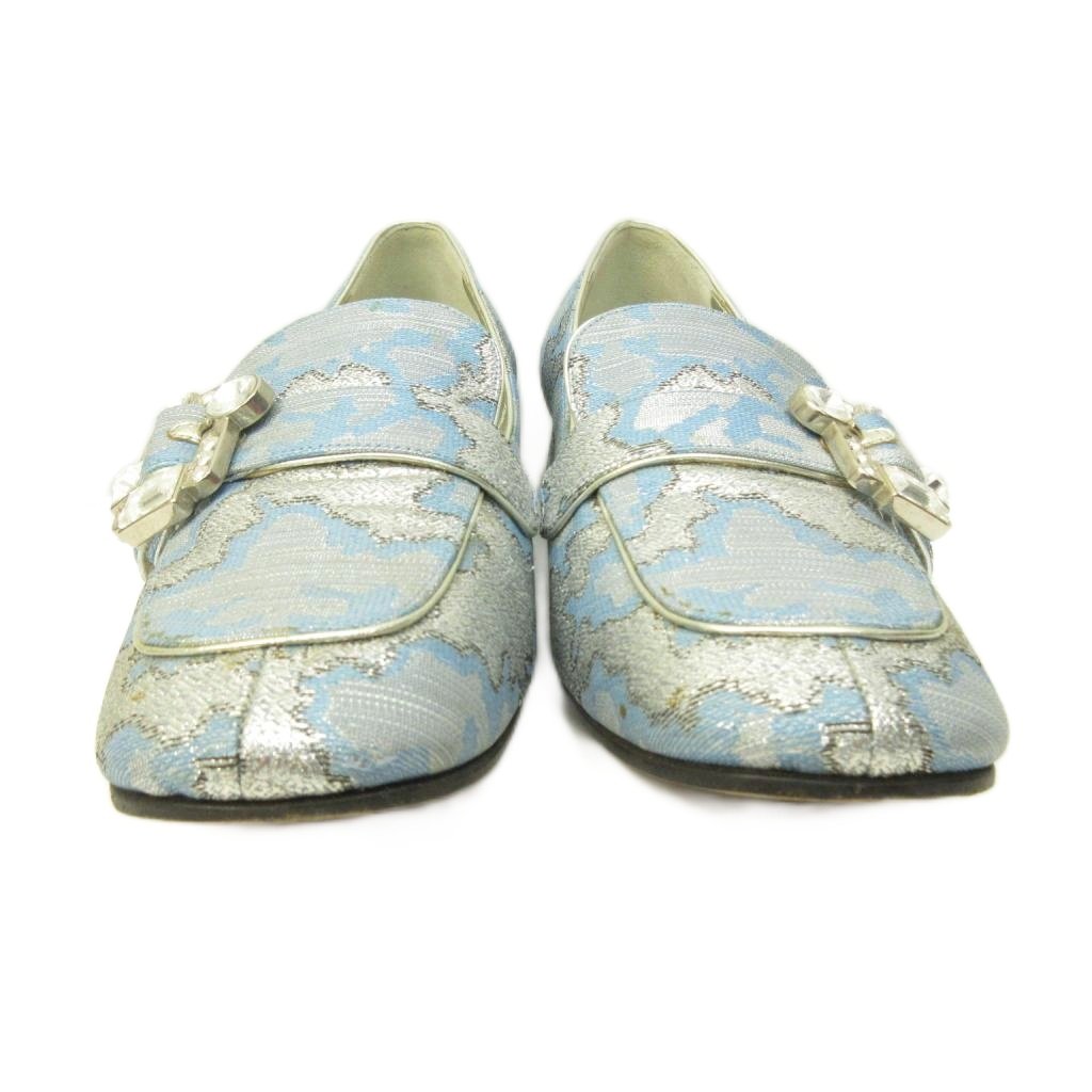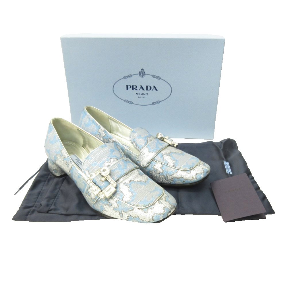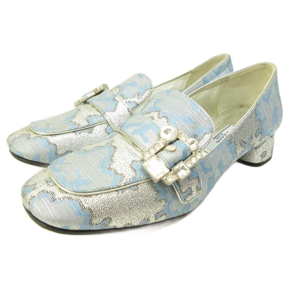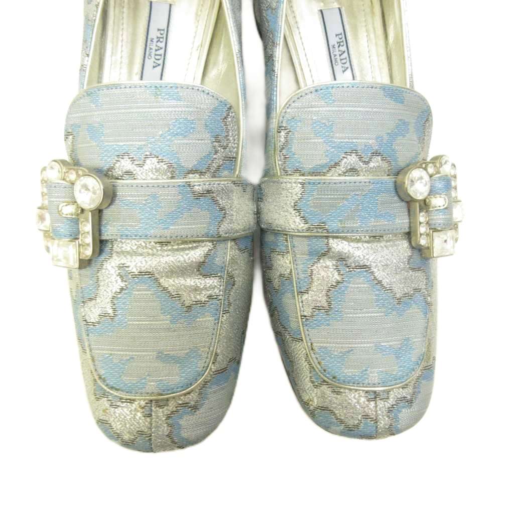 プラダ PRADA ビジュー ローファー パンプス チャンキーヒール 青 ブルー 37 約23.5cm ■MNK5