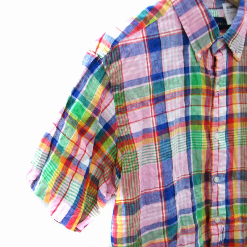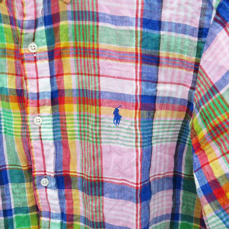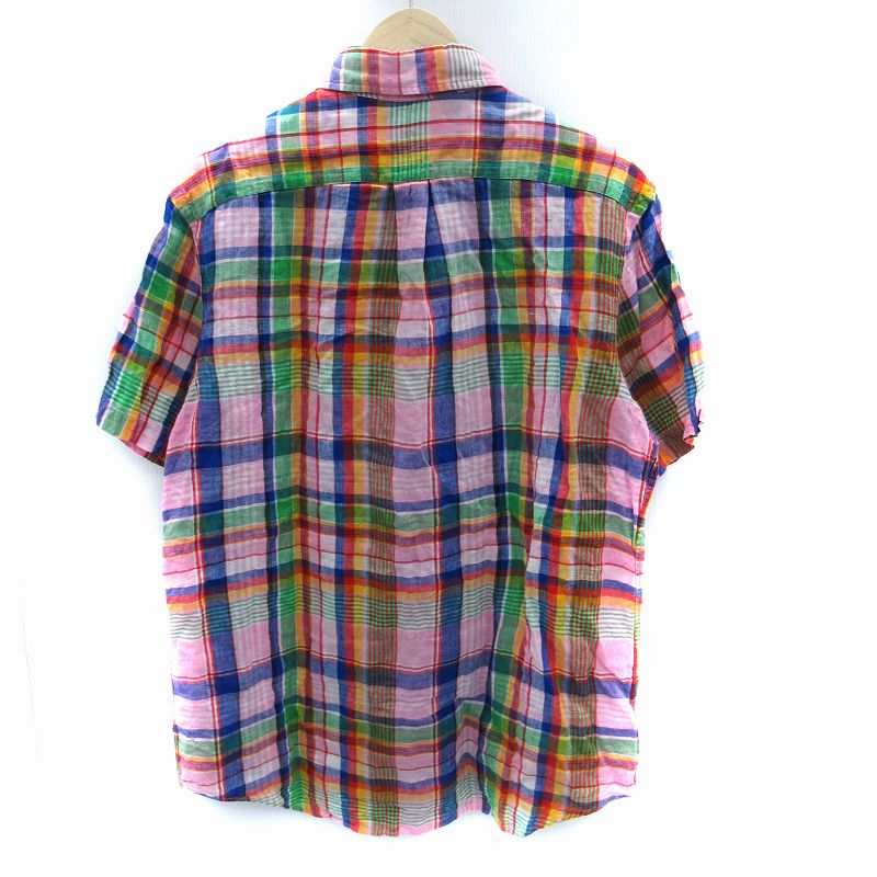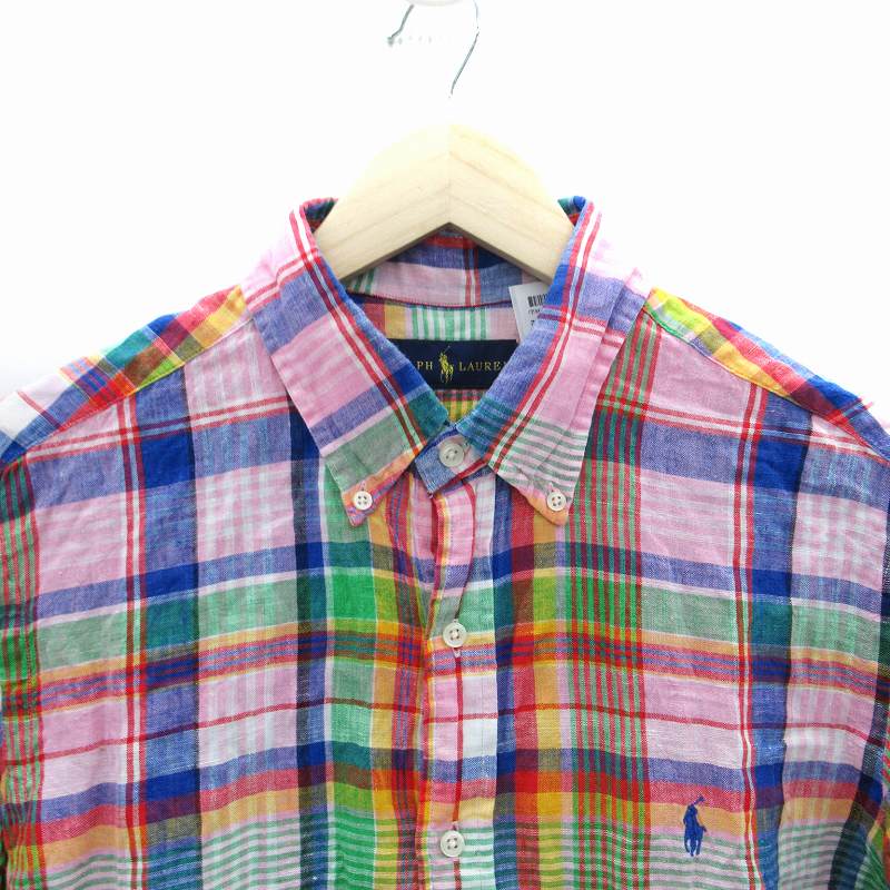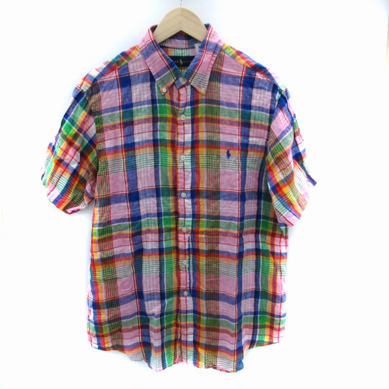 • ラルフローレン RALPH LAUREN カジュアルシャツ 半袖 チェック柄 ロゴ刺繍 リネン L マルチカラー ピンク 青 ブルー /SM9 ■GY53 メンズ