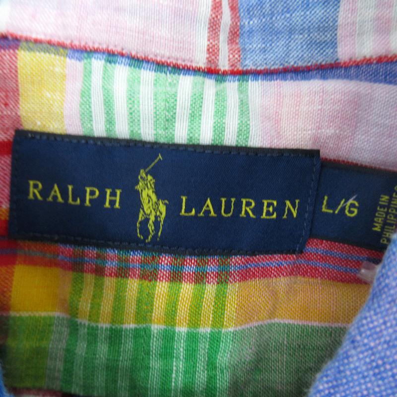 ラルフローレン RALPH LAUREN カジュアルシャツ 半袖 チェック柄 ロゴ刺繍 リネン L マルチカラー ピンク 青 ブルー /SM9 ■GY53 メンズ