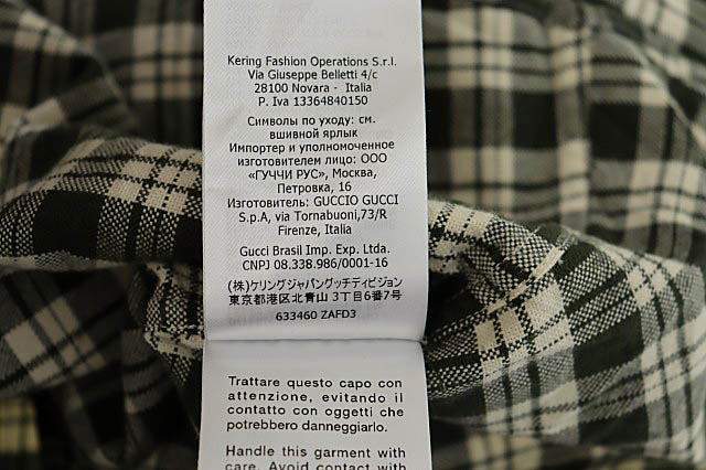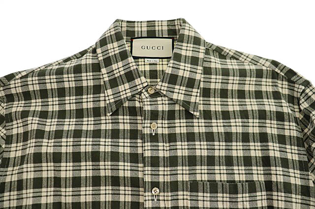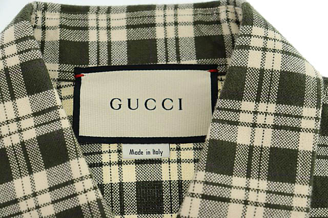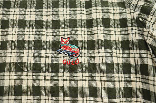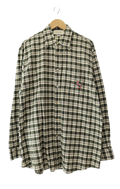 グッチ GUCCI 20AW キャットパッチ 刺繍 チェック柄 コットン 長袖 シャツ 633460 ZAFD3 15+ 緑 白 グリーン ホワイト ブランド古着ベクトル 中古☆AA★250924 メンズ