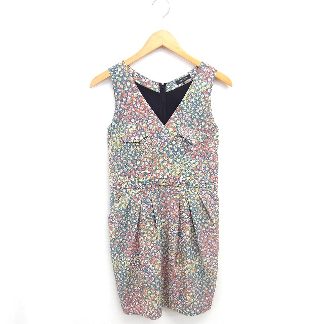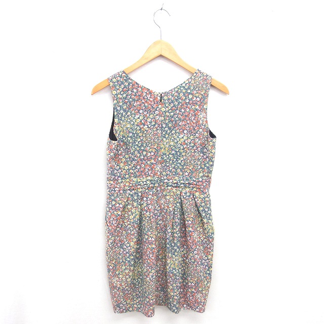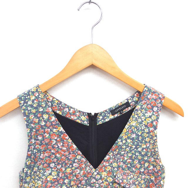 ラブレス LOVELESS ワンピース 花柄 タック ひざ丈 Vネック プルオーバー ノースリーブ 36 緑 グリーン オレンジ /TT レディース