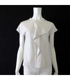 バンドカラー フリル トップス ブラウスライク プルオーバー フリル 落ち感 とろみ ストレッチ フレンチスリーブ 半袖 M アイボリー