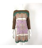 チュニック カットソー ペイズリー柄 シアー 異素材 切替 配色 ピコレース ウエストリボン 落ち感 とろみ 7分袖 M 茶 ブラウン マルチカラー