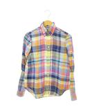 ボタンダウンシャツ 長袖 リネン 麻 チェック ロゴ刺繍 小さいサイズ 0 XS 青 ブルー /MN15 ■GY18