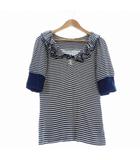 ニット カットソー 五分袖 デコルテ フリル ギャザー ボーダー M 紺 ネイビー トップス /T2