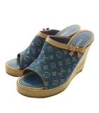 サンダル デニム キャンバス エスパドリーユ オープントゥ ウェッジソール モノグラム リボン 38 24.5cm インディゴ ベージュ /XZ ■GY19